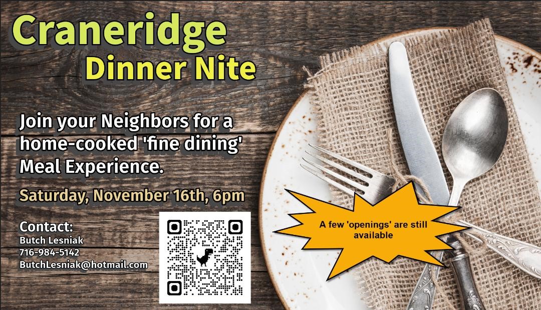 Craneridge Dinner Nite – Open slots! 11/16 @ 6:00pm