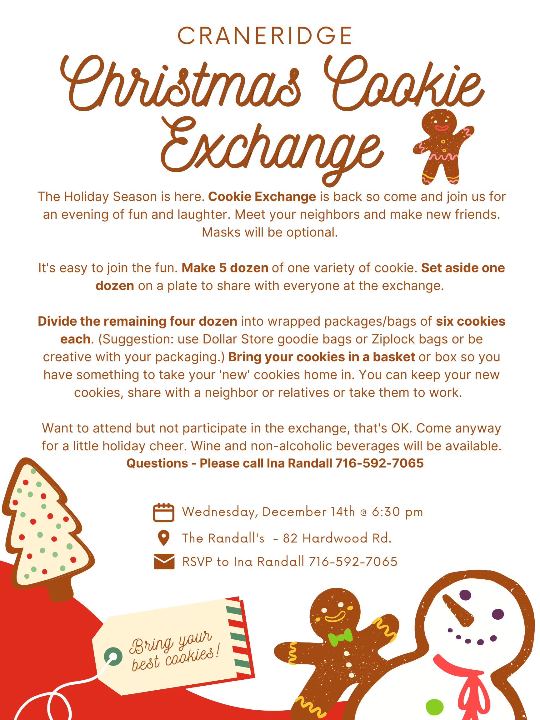 The Holiday Season is here. Cookie Exchange is back so come and join us for an evening of fun and laughter. Meet your neighbors and make new friends. Masks will be optional.