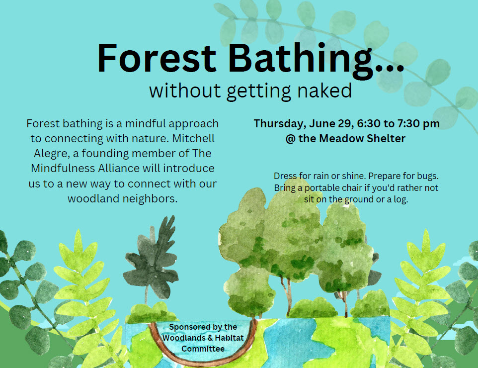 After a long workday (or just a long day…), join us for “Forest Bathing,” and experience a mindful way to connect with Craneridge woodlands. Thursday, June 29, 6:30 to 7:30 pm. Ages 14+ please.
