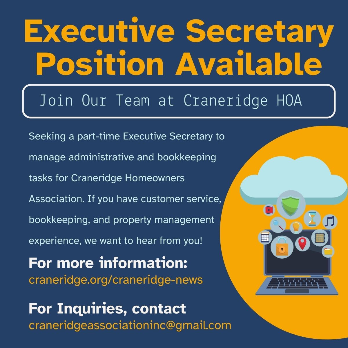 Seeking a part-time Executive Secretary to manage administrative and bookkeeping tasks for Craneridge Homeowners Association. If you have customer service, bookkeeping, and property management experience, we want to hear from you!