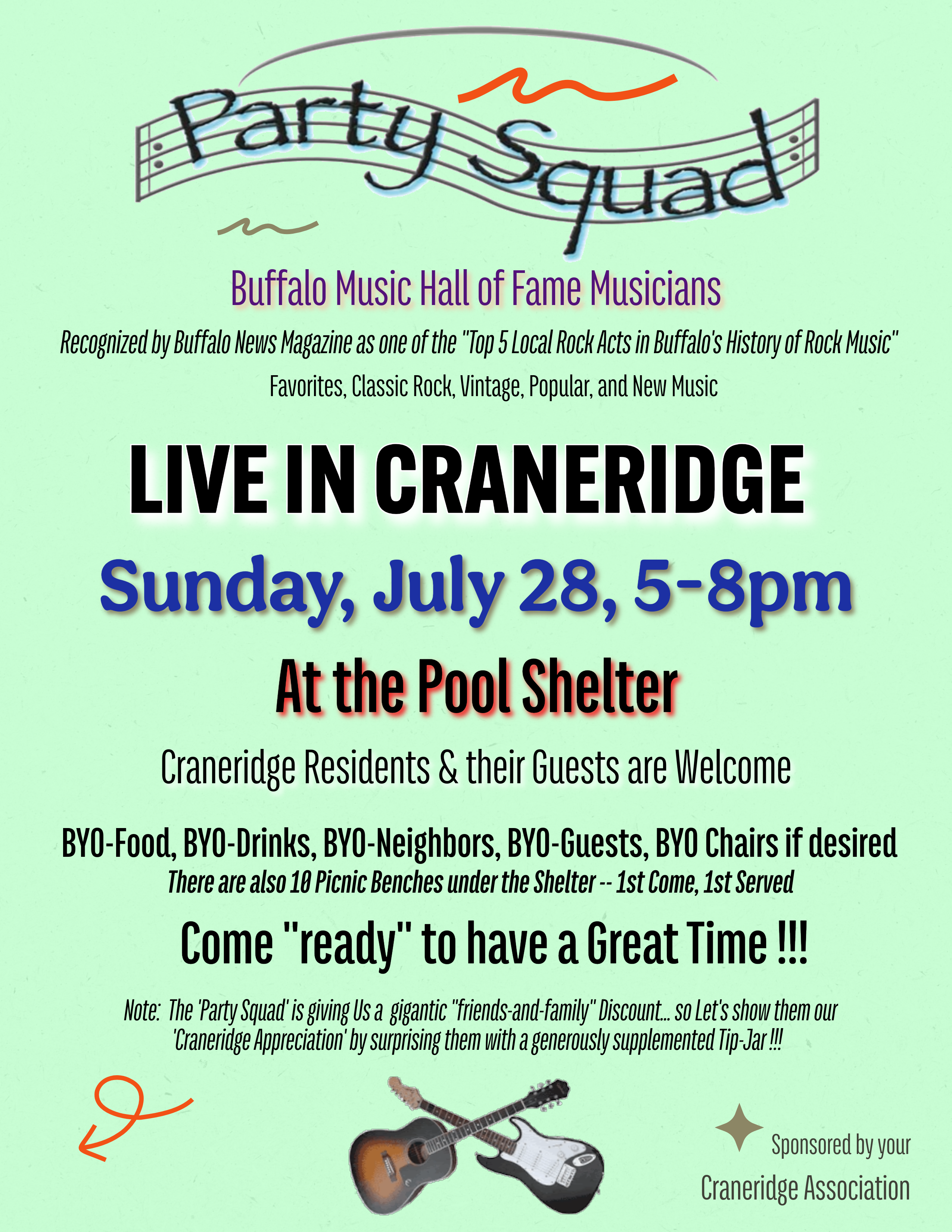 Party Squad Band this Sunday 7/28 See you at the Pool Shelter!!!!