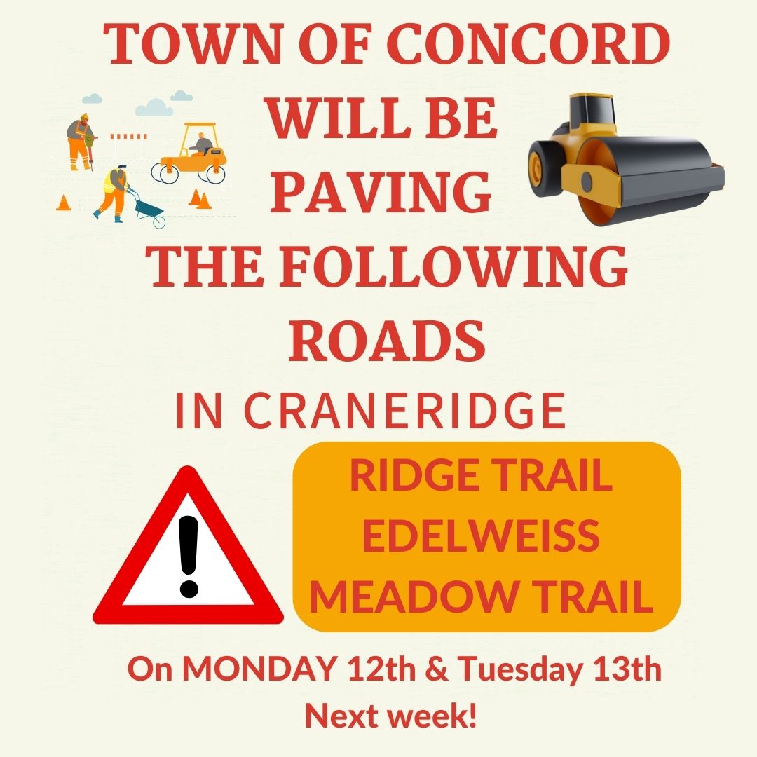 The Town of Concord plan to pave three roads in Craneridge next week. Midland Company intends to do the paving next Monday & Tuesday on Ridge, Edelweiss and Meadow Road/Trails. Please be patient!