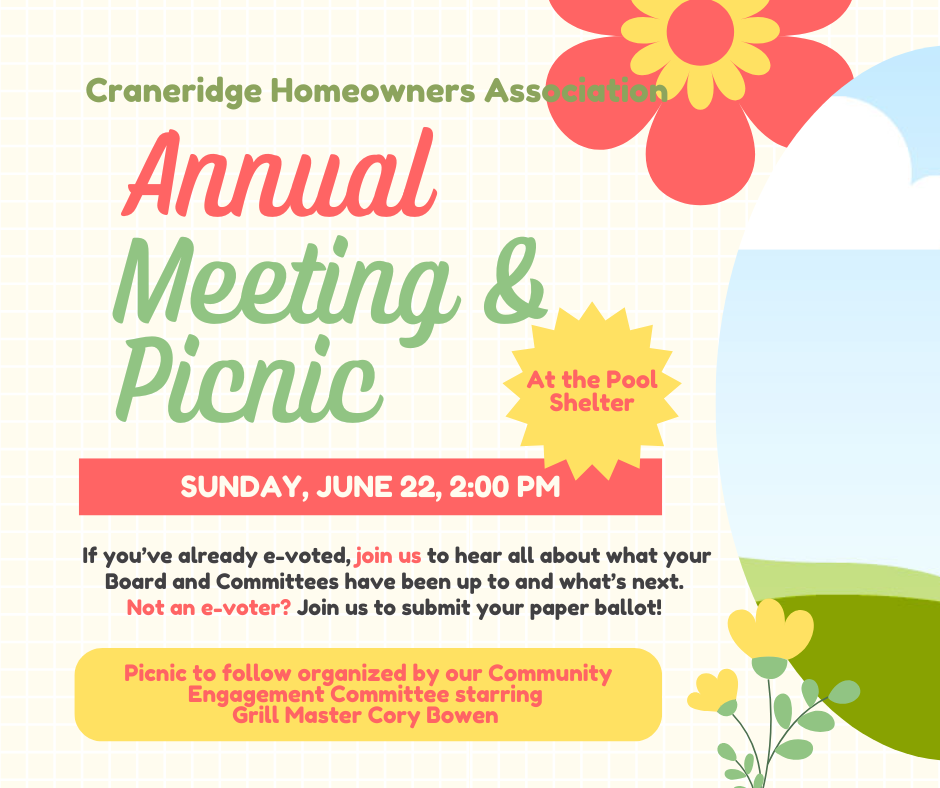 HEY EVERYONE! Please join us for the annual meeting to hear all the board and committee updates. Oh! And the picnic is going to be a blast.