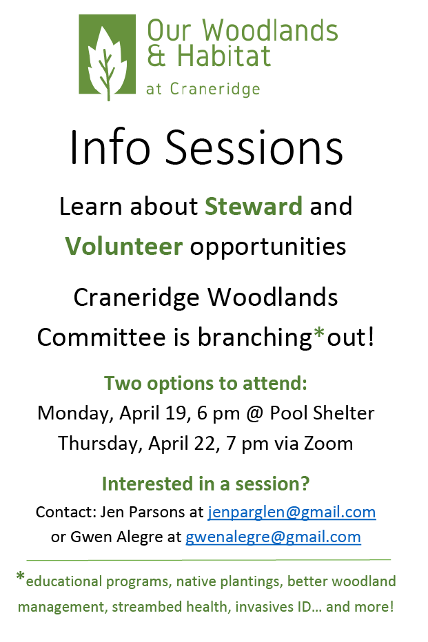 You are invited to attend one of two Woodlands Committee Info Sessions on April 19 or 23. We’ll share an update of what’s underway and what’s planned for the future. We’ll also provide details about the Volunteer and Steward opportunities and how you can help.