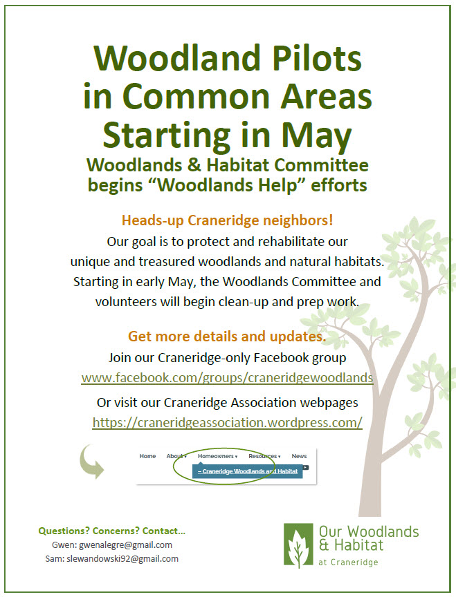 And we’re off! Big things are planned for our Craneridge woodlands this year. We’re just getting started. Plus, we have nearly 30 neighbors who have offered to lend a hand (thank you volunteers!) We’ll keep you posted through our Woodlands-only Facebook group (see below to join!) and through our Craneridge Woodlands webpages.